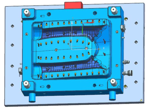 在汽車注塑模具中,針對汽車保險杠產(chǎn)品,模具設(shè)計時通常會采用先進(jìn)的內(nèi)分型面技術(shù)。其優(yōu)點(diǎn)是分型夾線隱藏在保險杠的非外觀面上,在汽車上裝配后看不到外觀夾線,不會影響產(chǎn)品外觀。但這種技術(shù)在難度與結(jié)構(gòu)上都要比外分型保險杠復(fù)雜,技術(shù)風(fēng)險也較高,模具成本與模具價格也會高于外分型保險杠很多,但因外觀美觀,在中高檔汽車中被廣泛應(yīng)用。