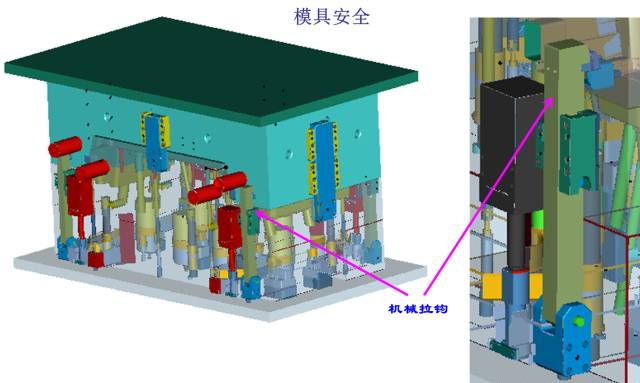 (1)第一級頂出采用4個油缸頂出同前模同步運(yùn)動頂出60MM,4個拉鉤為輔助機(jī)構(gòu);