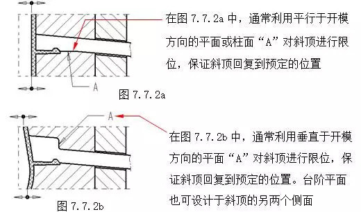 在斜頂機(jī)構(gòu)中,為了保證斜頂工作穩(wěn)定、可靠,應(yīng)該注意以下幾點(diǎn):(A)斜頂?shù)膭傂浴T鰪?qiáng)斜頂剛性一般采用:1.在結(jié)構(gòu)允許的情況下,盡量加大斜頂橫斷面尺寸。(參見第七章7.2節(jié))2.在可以滿足側(cè)向出模的情況下,斜頂?shù)男倍冉恰癆”盡量選用較小角度,斜角A一般不大于20°,并且將斜頂?shù)膫?cè)向受力點(diǎn)下移,如增加圖7.7.1a中的鑲塊2,同時鑲塊可以具有較高的硬度,提高 模具 的壽命。(B)斜頂橫向移動空間。如圖7.7.1a所示尺寸“D”,為了保證斜頂在頂出時不與膠件上的其它結(jié)構(gòu)發(fā)生干涉,應(yīng)充分考慮斜頂?shù)膫?cè)向分模距離、斜頂?shù)男倍冉恰癆”,以保證有足夠的橫向移動空間“D”。(C)斜頂在開模方向的復(fù)位。為了保證合模后,斜頂回復(fù)到預(yù)定的位置,一般采用下面的結(jié)構(gòu)形式。如圖7.7.2a;7.7.2b。